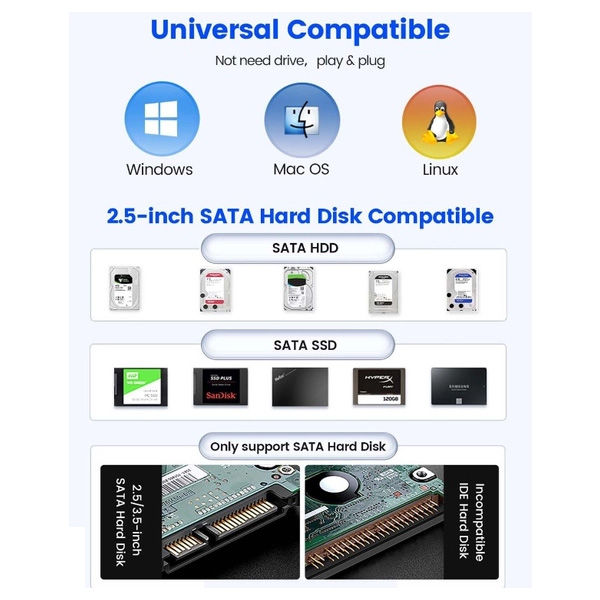 -جنس:ABS و آلومینیوم با دفع و انتقال حرارت بالا -پشتیبانی تا حداکثر ظرفیت 18 ترابیت -پشتیبانی از هارد دیسک های :SATA I,II,III -سرعت انتقال اطلاعات: حداکثر تا 5 گیگابیت بر ثانیه -دارای آداپتور برق 12 ولت و 2 آمپر -سازگاری با هارد دیسک 3.5 و 2.5 اینچی ساتا - پشتیبانی از سیستم عامل های: Windows,Linux,Mac -نیازمند اتصال به برق می باشد که آداپتور در بسته بندی موجوده -طول کابل: 1 متر -پشتیبانی از قابلیت Hot-Swap برای تعویض آسان هارد دیسک بدون نیاز به خاموش کردن دستگاه -پشتیبانی از پروتکل UASP و TRIM