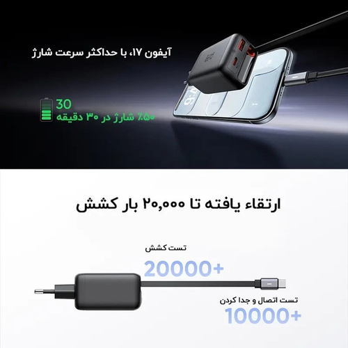 شارژر دیواری 35 وات مک دودو مدل FreeGo CH-1280 با طراحی پیشرفته و عملکرد بینقصش، دقیقاً همان چیزی است که شما برای شارژ سریع و ایمن دستگاههای خود نیاز دارید. این شارژر با فناوری GaN و توان خروجی 35 وات، همراهی ایدهآل برای خانه، محل کار یا سفر شماست. شارژر مک دودو FreeGo CH-1280 با دو پورت Type-C و USB و یک کابل متصل 65 سانتی متری Type C، امکان شارژ همزمان چند دستگاه را فراهم میکند. با پشتیبانی از شارژ سریع، این شارژ انواع موبایل و تبلت و... را با سرعت و کارایی بالا شارژ میکند. طراحی شیک و جمعوجور این شارژر با وزن تنها 119 گرم، آن را به گزینهای ایدهآل برای حمل و نقل تبدیل میکند. بدنه مقاوم از جنس پلیکربنات، این شارژر را در برابر حرارت و آسیبهای فیزیکی محافظت میکند. همچنین، کابل متصل 65 سانتیمتری آن به راحتی جمع و باز میشود و استفاده از شارژر را سادهتر میکند. شارژر مک دودو FreeGo CH-1280 فقط یک ابزار نیست؛ یک همراه مطمئن برای زندگی دیجیتال شماست. چه در سفر باشید، چه در محل کار یا خانه، این شارژر همیشه آماده است تا دستگاههای شما را با سرعت و ایمنی بالا شارژ کند.