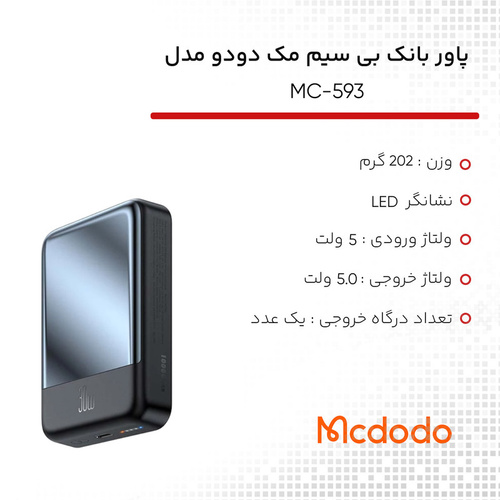 شرکت مک دودو یکی از شرکت های تولید کننده لوازم جانبی موبایل، تبلت و ... می باشد و به تازگی پاوربانک وایرلس 30وات مک دودو مدل MC-593 ظرفیت 10000 میلی آمپر ساعت - مگ سیف(آیفون 12 و بالاتر) را طراحی و در بازار عرضه کرده است. پاوربانک مک دودو مدل MC-593 ظرفیت 10000 میلی آمپر ساعت دارای دو خروجی است که شامل یک پورت Type-c با توان 30 وات و جایگاه شارژ وایرلس با توان 15 وات می شود که پورت Type-C آن به صورت ورودی خروجی عمل میکند. برای استفاده از قابلیت شارژ وایرلس، تلفن همراه شما نیز باید قادر به پشتیبانی از این حالت باشد.