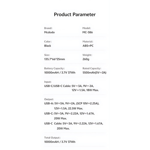 پاوربانک 30وات مک دودو مدل MC-386 با ظرفیت 10000 میلیآمپرساعت، یک شاهکار شیک و کاربردی که شارژ دستگاههای شما را با سرعت، ایمنی و طراحی بیمانند به اوج میرساند. این پاوربانک با بدنهای از پلیکربنات ضدحریق (PC) و پلیمر ABS، طراحی لاکچری و مینیمال را ارائه میدهد. این محصول جمعوجور بهراحتی در جیب شلوار جای میگیرد و با استانداردهای حملونقل هوایی بینالمللی، همراهی بیدغدغه در پروازها را فراهم میکند. MC-386 با توان خروجی حداکثر 22.5 وات و پشتیبانی از پروتکلهای شارژ سریع PD، QC، FCP، SCP، VOOC و AFC، از طریق سه پورت خروجی (یک پورت تایپسی 20 وات، یک کابل متصل تایپسی جمعشونده 20 وات به طول 65 سانتیمتر و یک پورت USB-A 22.5 وات) امکان شارژ همزمان سه دستگاه را فراهم میکند. خروجی کل 15 وات (5V~3A) برای ترکیب تایپسی و USB-A، کارایی را به اوج میرساند.