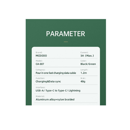 کابل تبدیل USB / USB-C به لایتنینگ / USB-C مک دودو مدل MC-CA-8070 طول 1.2 متر،کابل ها از قدیمی ترین روش های شارژ کردن گوشی های هوشمند هستند که کاربران می توانند با استفاده از آن ها علاوه بر شارژ کردن دستگاه های مختلف از آن برای انتقال اظلاعات و داده های مهم خود نیز استفاده کنند . یکی از شرکت های بزرگ و بسیار معروف در زمینه تولید کابل های انتقال شارژ و انتقال داده شرکت مک دودو (MCDODO) میباشد که سال هاست در این عرصه فعالیت دارد و از پیشرو های این صنعت می باشد که در سال های اخیر موفق به کسب جوایز متعدد در زمینه کیفیت و طراحی شده است که علاوه بر کابل تولید کننده فوق العاده قوی لوازم خودرو و منزل و ... نیز میباشد و نمایندگی های این برند در استرالیا و آفریقای مرکزی و جنوبی و چین و همینطور آمریکا (کالیفورنیا) فعالیت گسترده دارند .