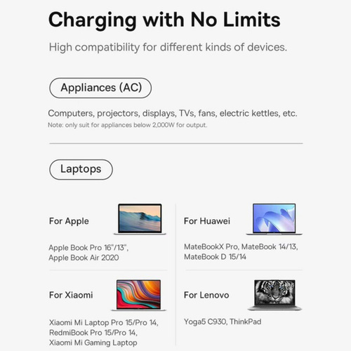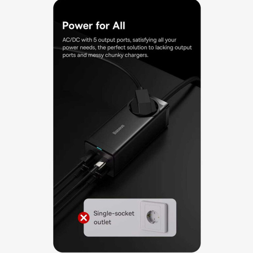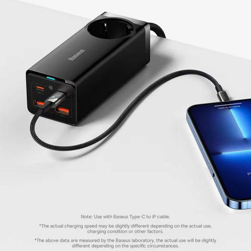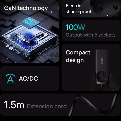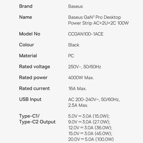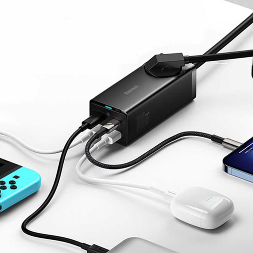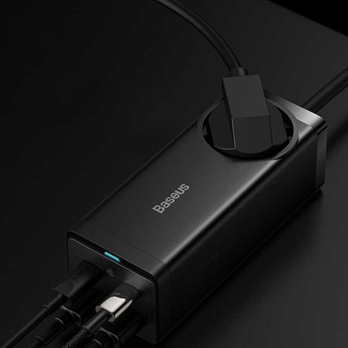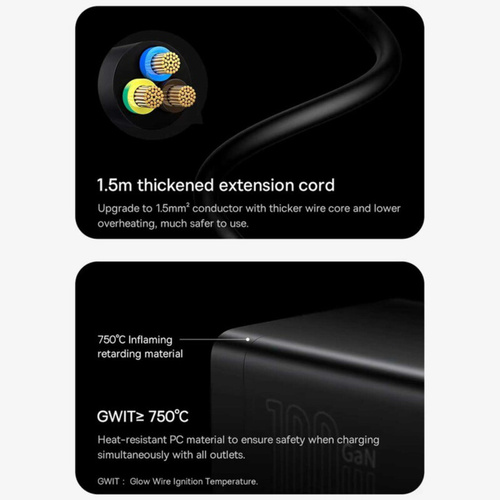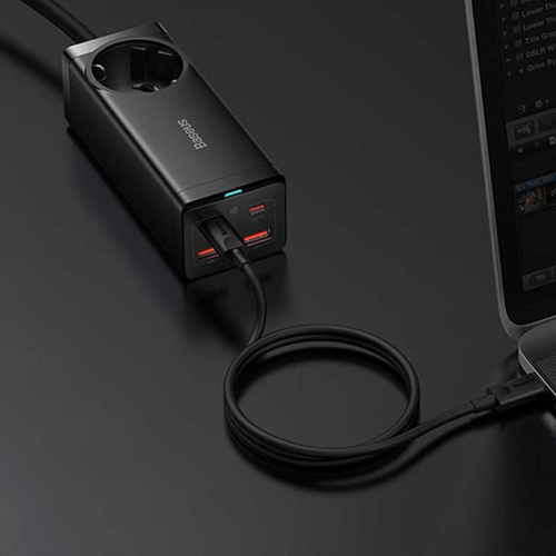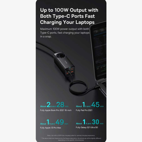 کابلی به طول 1.5 متر دارد و با کمک آن به راحتی میتوانید مشکل دور بودن از پریز برق را حل کنید. توان خروجی بیسوس برای چند راهی CGAN100-1ACE یک سوکت برق، دو پورت Type-C و دو پورت USB طراحی کرده؛ حداکثر توانی برابر با 100 وات دارد؛ بنابراین به راحتی میتوانید لپ تاپ، گوشی و تبلتهای مختلف با سیستمعاملهای اندروید و iOS را شارژ کنید. درگاه تایپ سی پروتکلهای Apple2.4A, QC2.0, QC3.0, QC4+, AFC, FCP, SCP, PE, PD3.0 and PP و ... را داراست و درگاه یو اس بی هم از پروتکلهای Apple2.4A, QC2.0, QC3.0, AFC, FCP, SCP, PE و ... برخوردار است. با این شارژر رومیزی اپلبوکپرو 2021 در مدت زمان 2 ساعت و 28 دقیقه، پد پرو 2021 در 1 ساعت و 45 دقیقه، آیفون 13 پرومکس در 1 ساعت و 49 دقیقه و گلکسی اس 21 اولترا در 1 ساعت و 30 دقیقه فول شارژ میشوند. فناوری GAN در طراحی این چند راهی بیسوس از فناوری گالیوم نیترید استفاده شده که یک ماده نیمه هادی جدید است که هم قابلیت رسانایی انتقال نیرو بالا مثل مس را دارد و هم میتواند یک عایق حرارتی و انرژی مانند شیشه باشد و در برابر اتصال کوتاه، بار اضافی، جریان و ولتاژ اضافی مقاوم است. به دلیل اینکه نیاز به عایق دوباره برای چندراهی نیست.