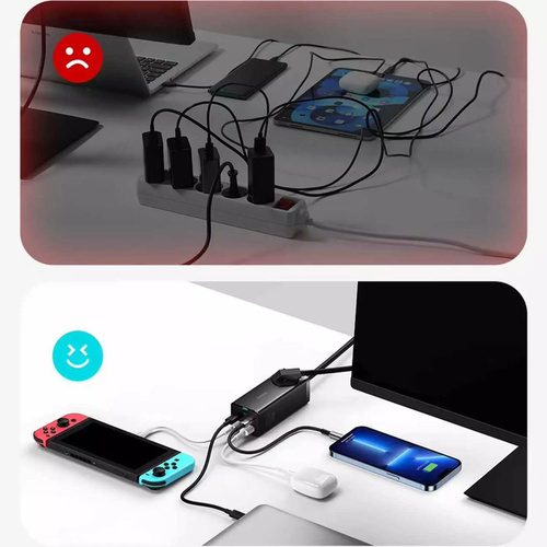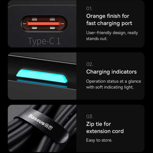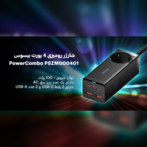 شارژر رومیزی 100 وات بیسوس مدل CCGAN100-1ACE - PSZM000401 به همراه کابل USB-C استفاده همزمان از چند وسیله برقی نیاز به خرید چندراهی برق که از کیفیت بالایی برخوردار باشد و در عین باکیفیت بودن ایمنی را هم تضمین کند بسیار اهمیت پیدا میکند. برند بیسوس چندراهی برقی با عنوان Baseus Power Strip with 100W GAN Charger CCGAN100-1ACE BS-PSZM000401 را به لیست محصولاتش اضافه کرده که با داشتن یک سوکت دوشاخه برق ، دو یو اس بی و دو تایپ سی امکان اتصال چند دستگاه به صورت همزمان برایتان فراهم خواهد بود. ساختاری باکیفیت چندراهی برق بیسوس Baseus PSZM000401 از پلی کربنات نسوز ساخته شده؛ به لطف این مواد بدنهای فوقالعاده مقاوم در برابر آسیب و حرارت بالا دارد؛ ابعادی جمعوجور به اندازه 120*48*41 میلیمتر دارد و فضای بسیار کمی را اشغال میکند. وزن آن هم 513 گرم است. چراغ نشانگر آبی رنگ هم نشانی از کارکرد صحیح آن و جریان یافتن برق است. دو شاخه چند راهی بیسوس از نوع EU میباشد که برای استفاده از آن در ایران نیازمند تبدیل نیست.