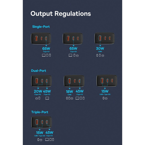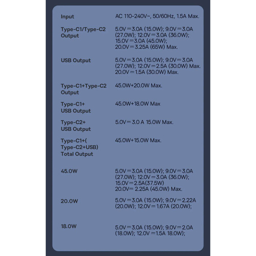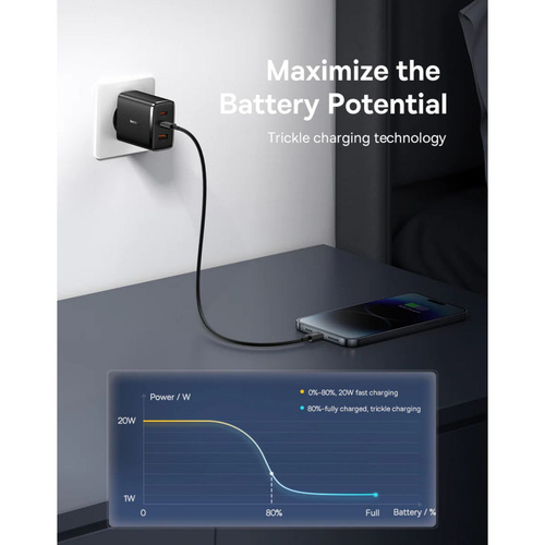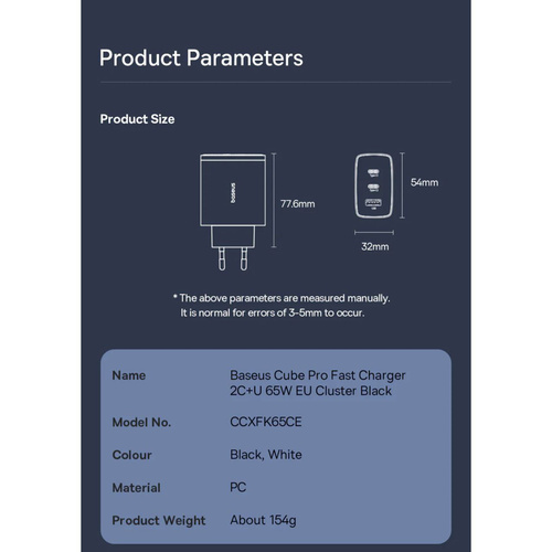 آیا نیاز به شارژ دستگاه های بیشتری دارید؟ نیازی به استفاده از شارژرهای اضافی یا صبر کردن برای آماده شدن یک قطعه از تجهیزات قبل از وصل کردن دستگاه دیگر نیست! شارژر 65وات بیسوس مدل Cube Pro 65W - P10152301113-00 - CCXFK65CE سه پورت ارائه می دهد ، بنابراین می توانید برای مثال، 2 گوشی هوشمند و یک کنسول بازی دستی را متصل کنید. علاوه بر این، شارژر به شما امکان میدهد همزمان 2 دستگاه را به سرعت شارژ کنید – با Baseus در زمان صرفهجویی خواهید کرد! شارژر Baseus OS-Cube Pro نه تنها در مورد عملکرد، بلکه در مورد ایمنی نیز است. فناوری پیشرفته BCT دما را کنترل می کند، بنابراین لازم نیست نگران داغ شدن بیش از حد محصول باشید. همچنین سیستم BPS2.0 قابل توجه است که وظیفه تنظیم هوشمند پارامترهای جریان را بر عهده دارد و آنها را با نیازهای دستگاه های متصل تطبیق می دهد. شارژر همچنین در برابر اضافه ولتاژ، اتصال کوتاه و جریان اضافی از جمله موارد دیگر محافظت می شود. علاوه بر این، فناوری شارژ Trickle از باتری دستگاه های متصل در برابر آسیب محافظت می کند. تکنولوژی GaN5: آخرین فناوری GaN5 نه تنها بهره وری انرژی را افزایش می دهد، بلکه باعث می شود شارژر در دمای پایین تری کار کند. این به معنای عمر طولانی تر دستگاه و شارژ ایمن برای دستگاه های شما است. کنترل دمای BCT: فناوری کنترل دمای Baseus BCT از فناوری نانو برای تسریع اتلاف گرما استفاده می کند و عملکرد پایدار و موثر شارژر را حتی در هنگام استفاده شدید تضمین می کند. تنظیم قدرت شارژ: سیستم توزیع برق Baseus BPS به طور خودکار توان و ولتاژ خروجی را تنظیم می کند که شارژ بهینه هر دستگاه متصل را تضمین می کند: از لپ تاپ گرفته تا تلفن های هوشمند و تبلت. شارژ سریع: به لطف پشتیبانی از پروتکل های شارژ سریع (Power Delivery 3.0، Quick Charge 3.0، PPS، SCP، FCP یا AFC)، این شارژر شارژ فوری و موثر را تضمین می کند و به شما امکان می دهد در مدت زمان کوتاهی از دستگاه های کاملاً شارژ شده لذت ببرید. ایمنی حرف اول را می زند: حفاظت های داخلی، از جمله اضافه ولتاژ، اضافه بار و کمبود ولتاژ، ایمنی دستگاه های الکترونیکی شما را در طول هر چرخه شارژ تضمین می کند. لازم نیست نگران گرمای بیش از حد یا رعد و برق باشید.