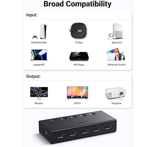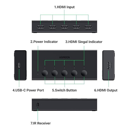 سوئیچ HDMI یوگرین 1 به 5 مدل CM568-90512 4K، برای اشتراک گذاری چند سیستم پخش کننده‌ی تصویر به یک نمایشگر استفاده می‌شود. این محصول یکی از کاربردی‌ترین اقلامی است که امروزه با پیشرفت تکنولوژی استفاده از آن نیز به نوعی الزام تبدیل گشته است. سوئیچ HDMI یوگرین 1 به 5 مدل CM568-90512 4K، زمانی مورد استفاده قرار می‌گیرد که بخواهید از چند دستگاه در موقع لزوم استفاده کنید. این وسیله اتصال کننده دستگاهای پخش کننده به نمایشگر بصورت جداگانه است. بوسیله ریموت کنترل محصول و یا دکمه‌ی تعبیه شده روی دستگاه می‌توان به صورت جداگانه پورت HDMI دستگاه را سوئیچ کرد. دارای نصب آسان می‌باشد و بهترین گزینه برای کنفرانس‌ها و سرگرمی است. با استفاده از سوئیچ HDMI یوگرین 1 به 5 مدل CM568-90512 4K، می‌توان 5 تصویر مختلف را همزمان به یک نمایشگر به متصل کرد. این سوئیچ پشتیبانی از کیفیت تصویر 4K@60Hz را دارد و دارای درگاه برق USB-C می‌باشد.این محصول با انواع کنسول های بازی و ذخیره ساز های تصاویر (DVR,NVR) سازگار می باشد.