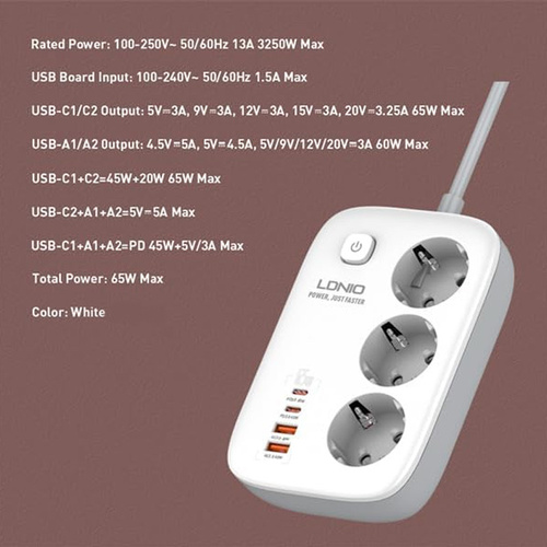 از دیگر مزایای این محصول می توان به این نکته اشاره کرد که توان 65 واتی خروجیهای Type-c این محصول باعث می شود با بالاترین سرعت ممکن گوشی خود را شارژ کنید. مشخصات فنی در چندراهی برق الدینیو مدل 3436 به شرح زیر است: ورودی یو اس ابی: V240-100 خروجی تایپ سی : 5V=3A | 9V=3A | 12V=3A | 15V=3A | 20V=3.25A | | 65W خروجی یو اس بی : 4.5V=5A | 5V=4.5A | 5V/9V/12V/20V=3A | 60W خروجی دو پورت تایپ سی به طور همزمان : 45W + 20W توان خروجی کل 65 وات است و در صورت استفاده ی همزمان از درگاه ها این توان بین درگاه ها تقسیم میشود.