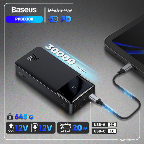 پاوربانک 20 وات بیسوس مدل PPBD30K ظرفیت 30000 میلی آمپر ساعت