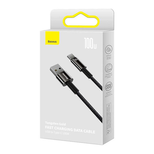 کابل فست شارژ باسئوس Tungsten Series Fast Charging با ویژگی‌ های برجسته خود، انتخابی ایده‌آل برای همه کسانی است که به دنبال کیفیت و کارایی بالا هستند. با حداکثر توان خروجی 100 وات و سرعت انتقال داده 480 مگابیت بر ثانیه، این کابل نیازهای شارژ سریع و انتقال داده‌های حجیم شما را به بهترین شکل ممکن برآورده می‌کند. طراحی شیک و مقاوم و سازگاری با فناوری‌ های شارژ سریع، همه این ‌ها این کابل را به گزینه‌ای بی ‌نظیر و جذاب تبدیل کرده است. با انتخاب این کابل، تجربه‌ای سریع، ایمن و بی‌دردسر در شارژ و انتقال داده‌ها خواهید داشت.کابل فست شارژ باسئوس Tungsten Series Fast Charging دارای طراحی ساده و در عین حال جذاب است. این کابل با طول یک متر، انتخابی مناسب برای استفاده روزمره و حمل و نقل آسان محسوب می ‌شود.رنگ مشکی آن نه تنها ظاهری شیک و لوکس به کابل می‌ بخشد، بلکه ظاهری جذاب نیز دارد که به راحتی توجه شما را جلب می‌کند. جنس این کابل از پلاستیک بافته شده است که مقاومت بالایی در برابر کشیدگی و شکستگی دارد و دوام بالایی را تضمین می‌کند. این کابل دارای 6 رشته 292 هسته‌ای است که باعث می‌شود توانایی انتقال جریان بالا و پایداری در شارژ را داشته باشد کانکتورهای این کابل از آلیاژ زینک براق ساخته شده‌اند که علاوه بر زیبایی، استحکام و مقاومت در برابر زنگ ‌زدگی را نیز ارائه می ‌دهند. کانکتور USB و Type-C هر دو از این آلیاژ ساخته شده‌اند، که نه تنها ارتباط پایداری را فراهم می‌کنند، بلکه محافظت عالی در برابر سایش و ضربه دارند.کابل فست شارژ باسئوس Tungsten Series Fast Charging از فناوری‌های پیشرفته شارژ سریع مانند Quick Charge (QC) و Power Delivery (PD) پشتیبانی می‌کند. این فناوری‌ ها امکان ارسال انرژی بیشتر به دستگاه‌ ها را فراهم می‌کنند، که به معنای شارژ سریع‌ تر و کارآمدتر است.ابل فست شارژ باسئوس Tungsten Series Fast Charging با سرعت انتقال داده‌های 480 مگابیت بر ثانیه، به شما امکان می‌دهد تا فایل‌ های حجیم خود را در کمترین زمان ممکن انتقال دهید. این کابل با سرعت بالا قادر است داده‌ها را با سرعت بسیار زیادی منتقل کند، که این به معنای انتقال 480 میلیون بیت در هر ثانیه است.